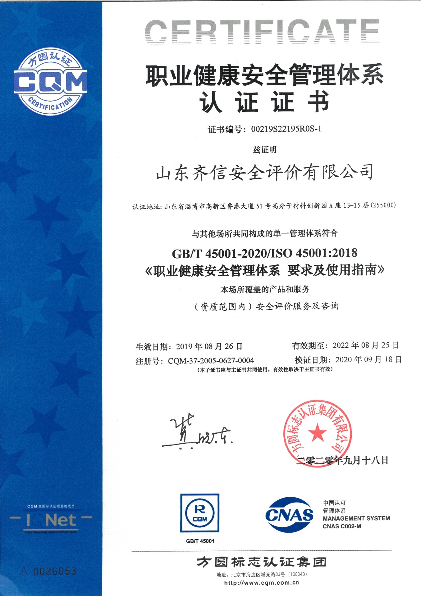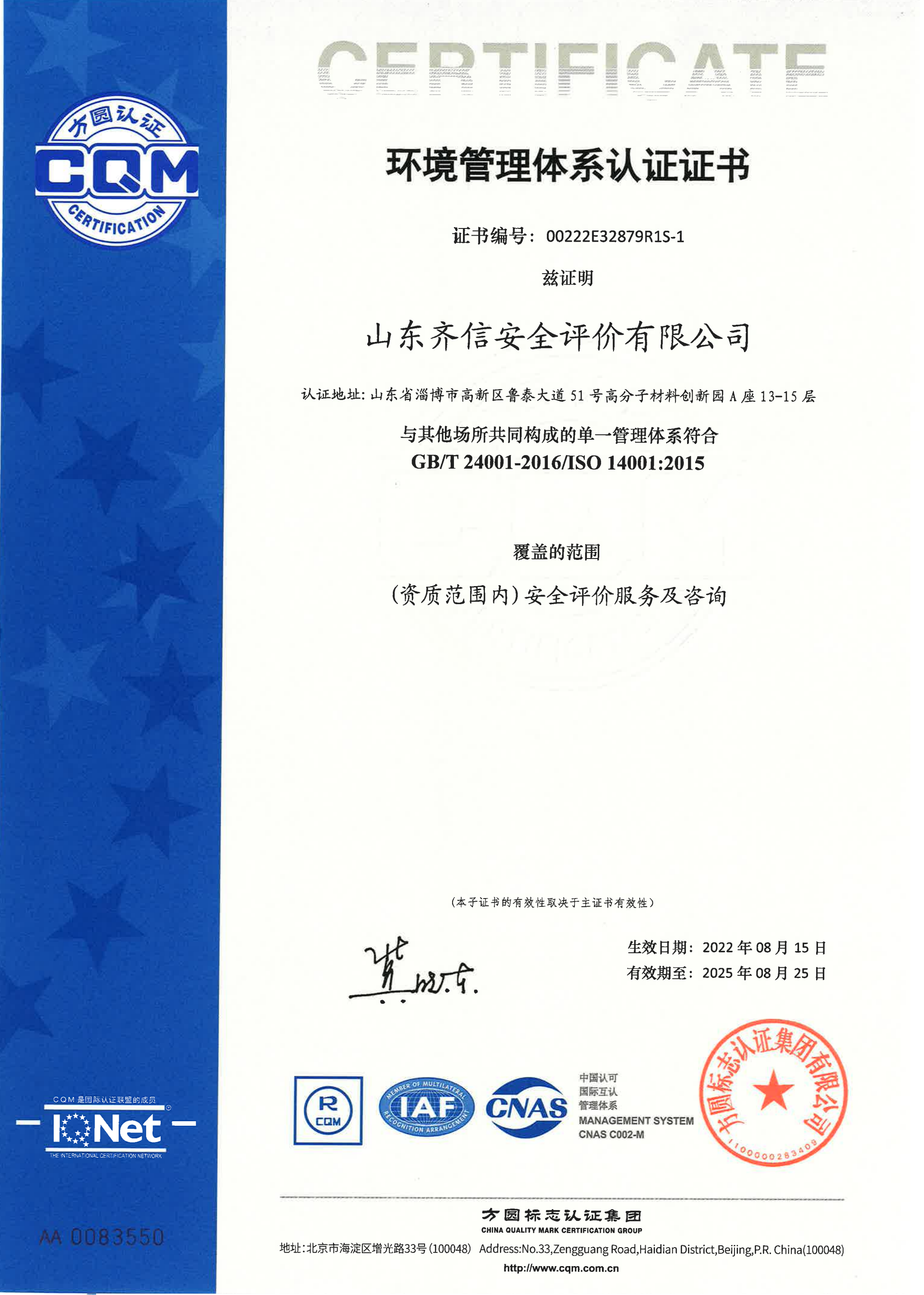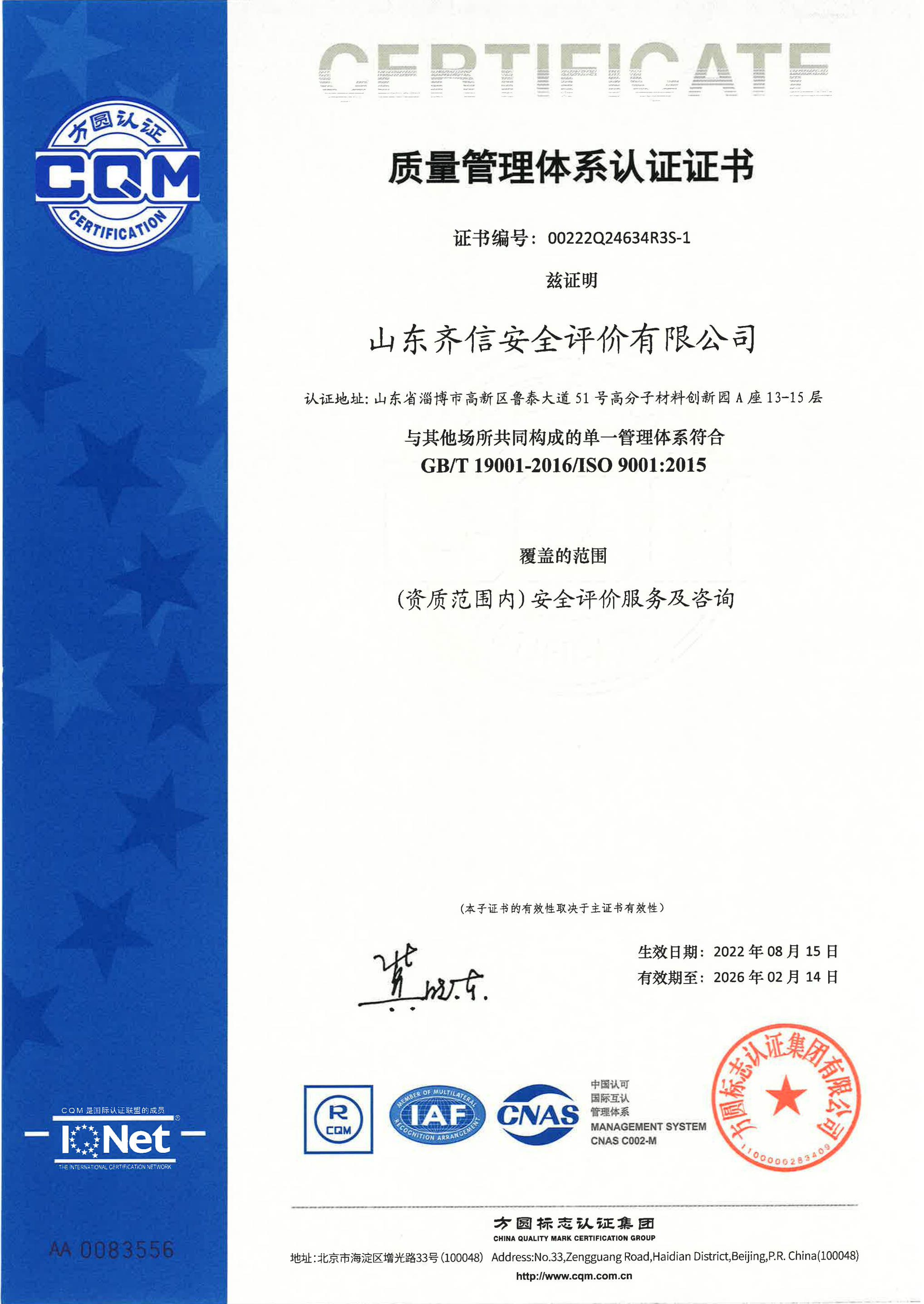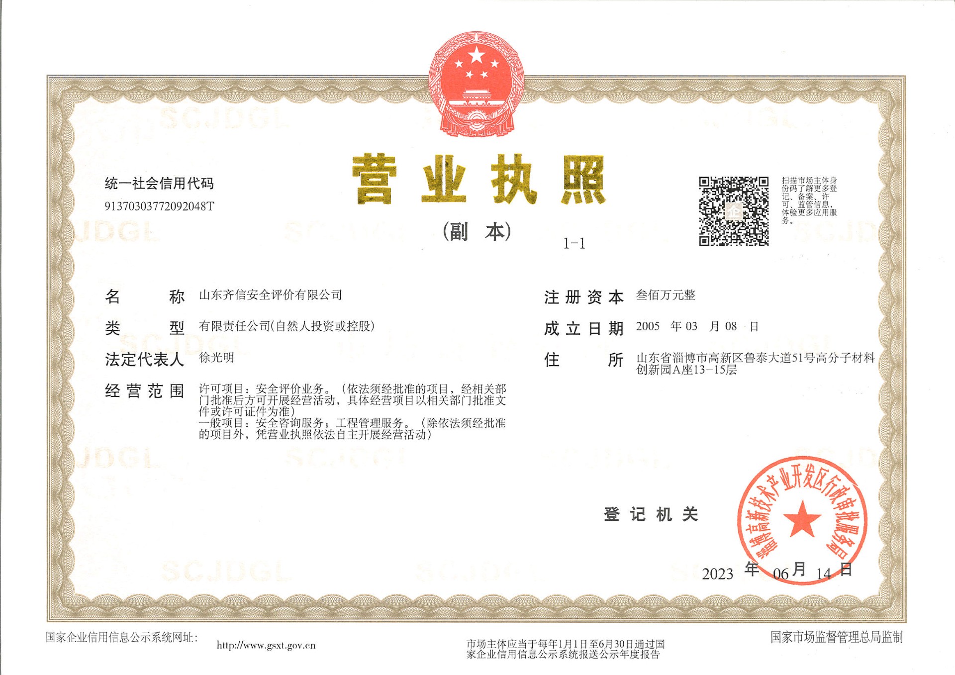 山東齊信安全評價有限公司成立于2005年3月,注冊資本300萬元人民幣,固定資產(chǎn)總值804.8728萬元。法定代表人徐光明,注冊地址及辦公地址位于淄博高新區(qū)魯泰大道51號高分子材料創(chuàng)新園A座13-15樓。2005年9月取得安全評價機(jī)構(gòu)乙級資質(zhì)。自國家應(yīng)急部1號令實(shí)施以來,公司于2020年1月15日取得新安全評價資質(zhì),業(yè)務(wù)范圍包括:陸上油氣管道運(yùn)輸業(yè);石油加工業(yè),化學(xué)原料、化學(xué)品及醫(yī)藥制造業(yè);金屬冶煉。2018年12月21日取得安全生產(chǎn)標(biāo)準(zhǔn)化二級評審單位,評審范圍:危險化學(xué)品、紡織、建材、輕工、冶金、機(jī)械。 公司現(xiàn)有人員41人,其中專職安全評價師37人,注冊安全工程師26人,研究員1人、碩士5人、雙學(xué)士1人,山東省安全專家?guī)鞂<?人、教授級高工1人,高級工程師8人、工程師22人,專職危險化學(xué)品標(biāo)準(zhǔn)化評審員、工商貿(mào)標(biāo)準(zhǔn)化評審員30人,本科以上學(xué)
